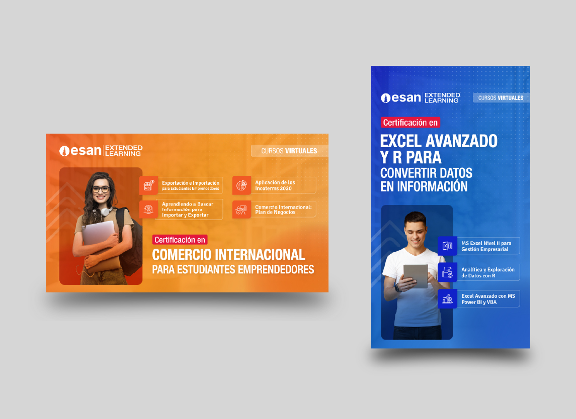 Diseño y adaptación de piezas gráficas para campañas institucionales del programa Extended Learning, orientado a alumnos y profesionales externos.